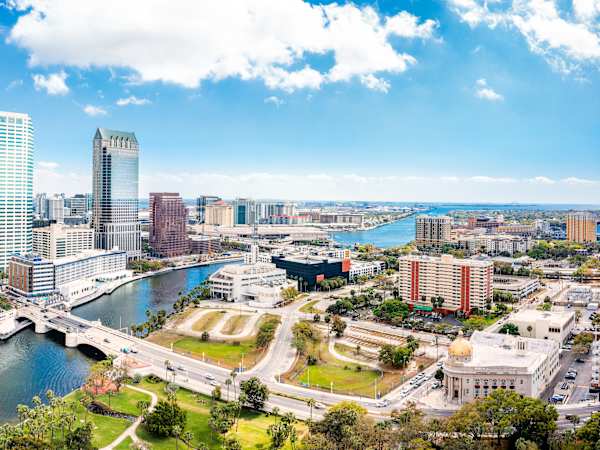 Tampa features the downtown Riverwalk with restaurants and bars, plus Busch Gardens Tampa Bay sprawling over 300 acres with rollercoasters and safari experiences through the Serengeti Plain. Adventure Island water park provides additional family entertainment.