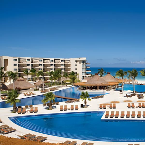 Le Dreams® Riviera Cancún est entouré par des piscines aux eaux scintillantes, des jardins tropicaux luxuriants et une plage rehaussée de palmiers.